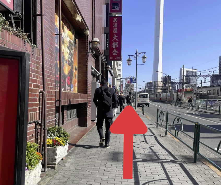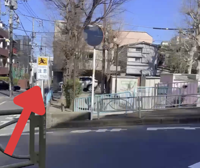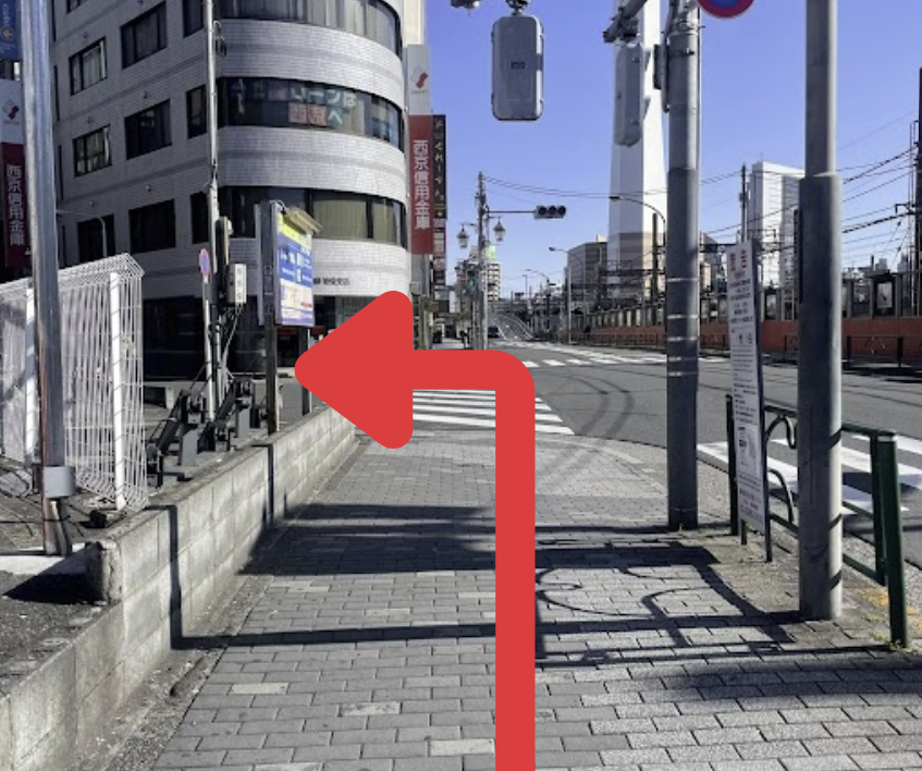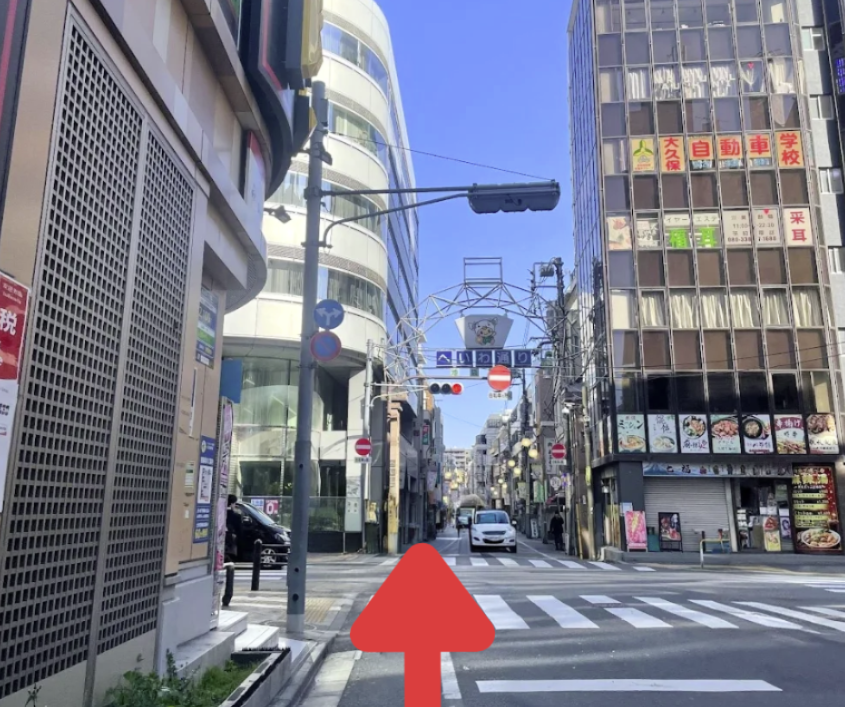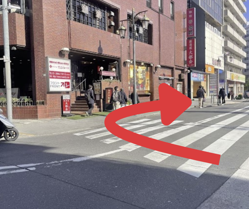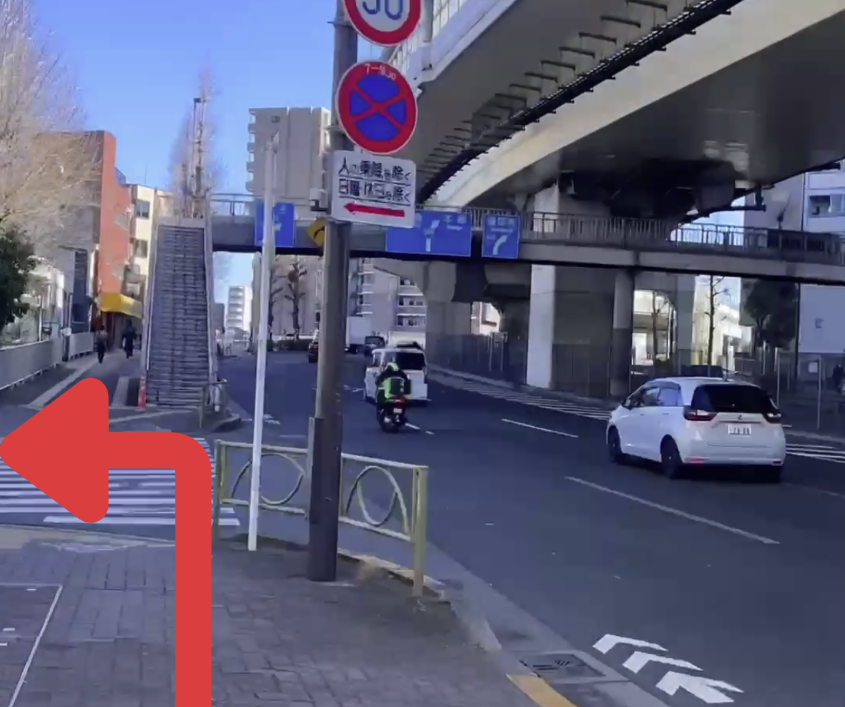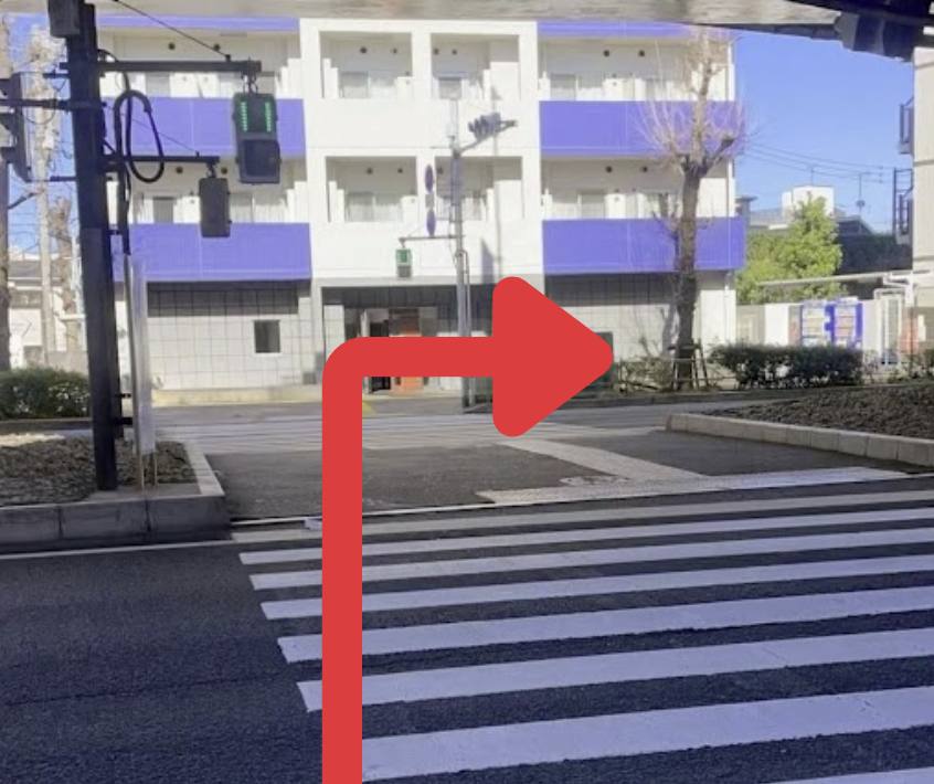 ② 階段を出た先にある、信号のない横断歩道を渡り、右折します。