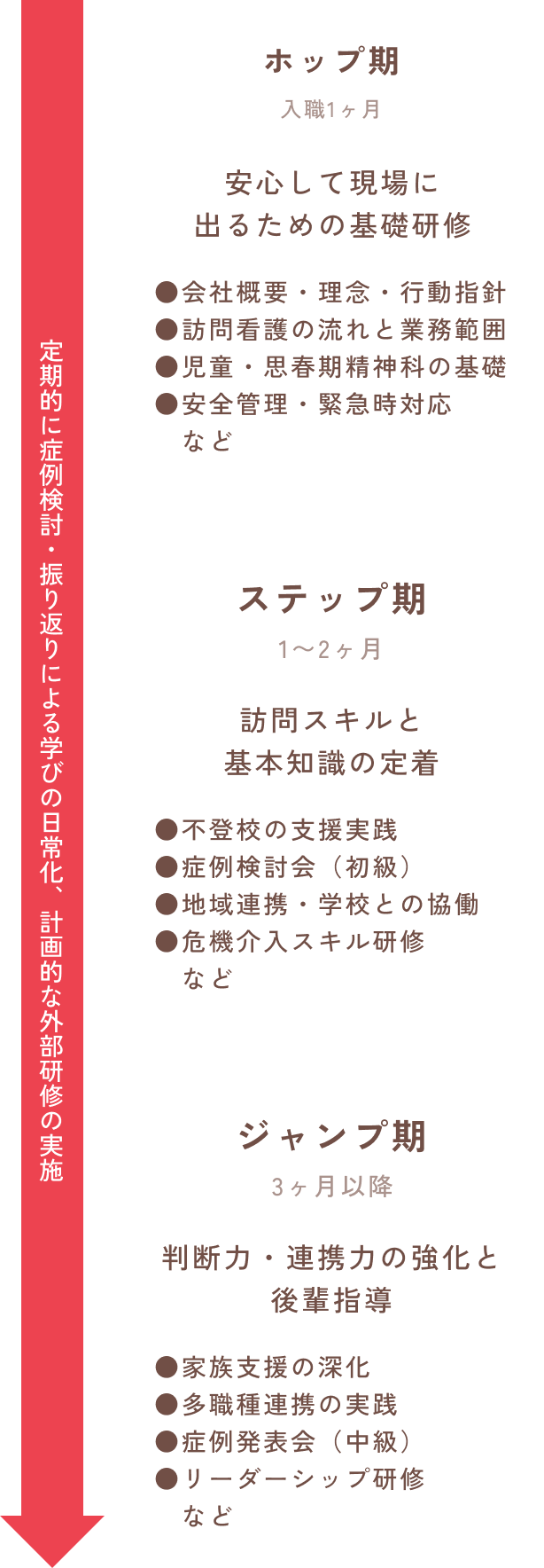 専門性と管理スキルを磨き、将来は各地域で所長として活躍していただくキャリアステップがあります。ケアプロの訪問看護実績をもとにした、職種別の段階的な人材育成プログラムで、児童・思春期の精神科訪問看護の専門性を体系的に習得できます。